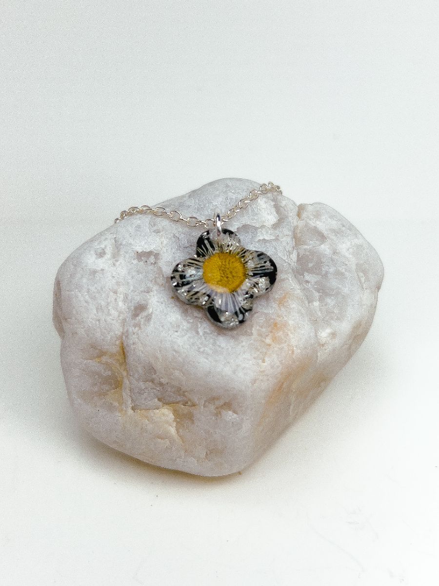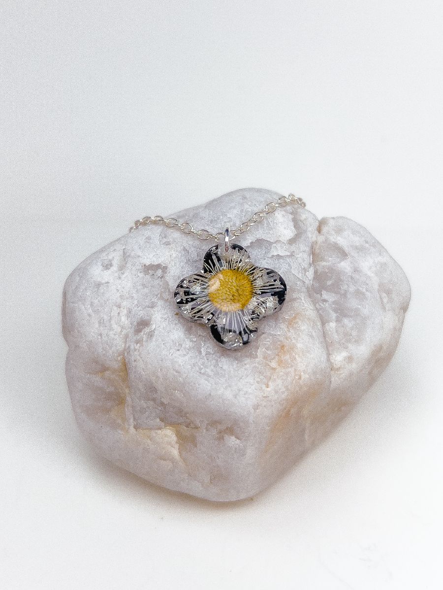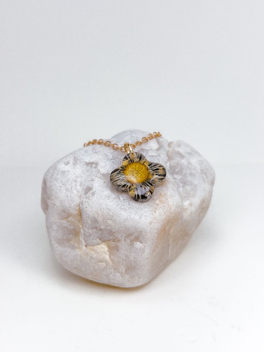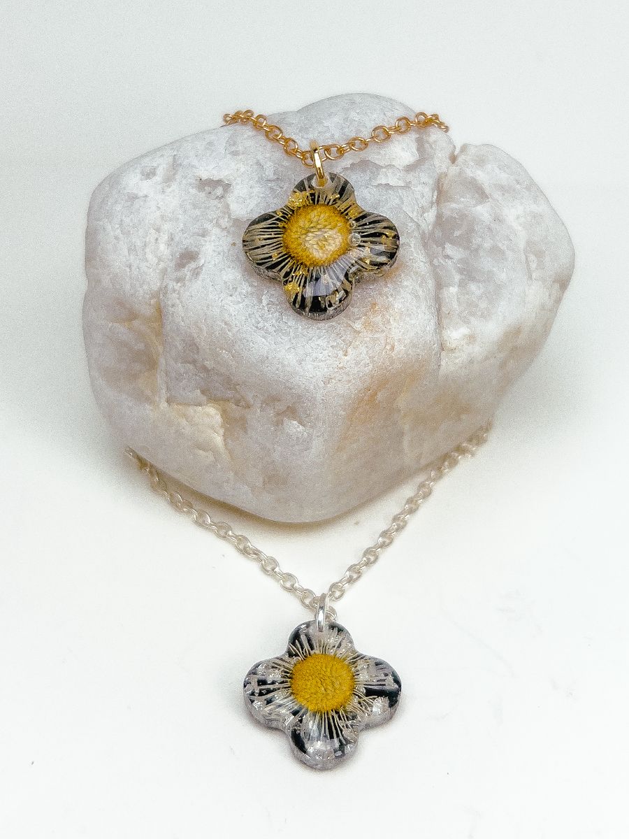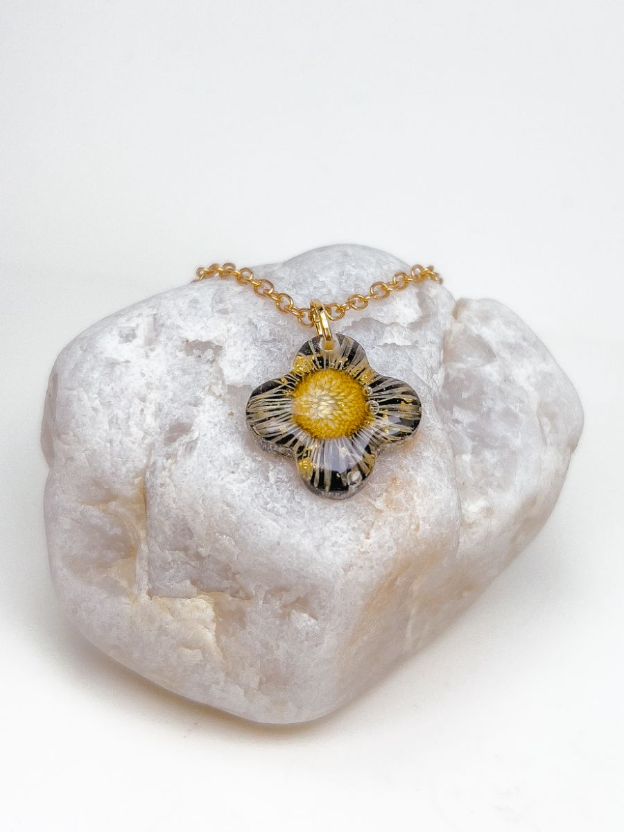 This necklace once began as a flower growing in nature. Each flower is hand-picked and delicately pressed to preserve the details and colours of its petals. Once pressed, it is transformed into an original piece of jewellery, a piece of Nova Scotia nature to wear close to your heart.