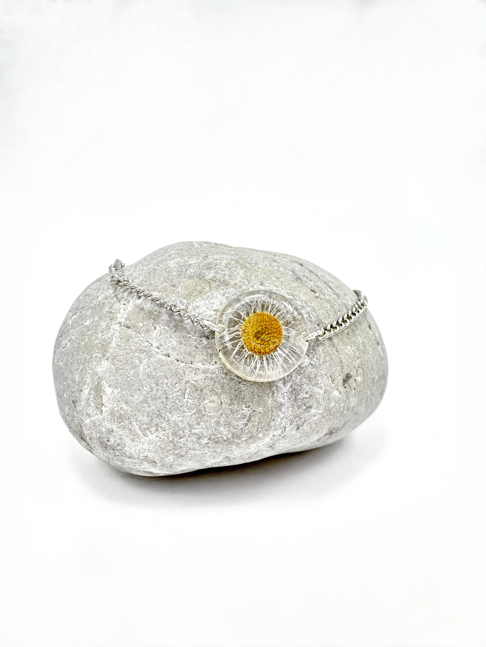 This bracelet once began as a flower growing in nature. Each flower is hand-picked and delicately pressed to preserve the details and colours of its petals. Once pressed, it is transformed into an original piece of jewellery, a piece of Nova Scotia nature to wear close to your heart.